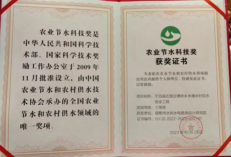 我院設(shè)計的“于田縣達理亞博依鄉(xiāng)未通水村飲水安全工程”,榮獲第九屆(2022-2023年度)農(nóng)業(yè)節(jié)水科技獎“大北農(nóng)杯”三等獎。項目設(shè)計人員馬振宇、董明田、郜曉輝、青海華、杜睿超、李金麗、張明玉榮獲個人三等獎。