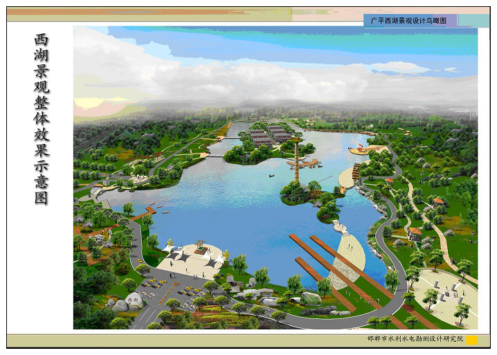 按照省委、省政府提出的“三年大變樣、三年上水平、三年出品位”的原則,立足“高站位、大手筆、大氣魄”,圍繞建設(shè)“秀美鵝城、清宜廣平”的目標(biāo),在充分分析廣平縣現(xiàn)有水系和城市規(guī)劃的基礎(chǔ)上,圍繞環(huán)城水系建設(shè),新建人工湖泊,修建引蓄水工程,打造環(huán)城水系沿線濱水景觀。受廣平縣水利局委托,我院完成了本次廣平縣環(huán)城水系規(guī)劃。