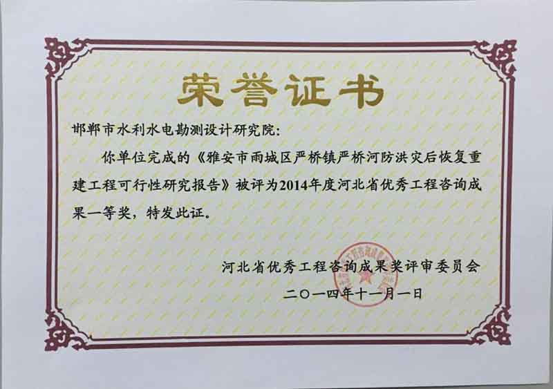 2014年度河北省優(yōu)秀工程咨詢成果一等獎